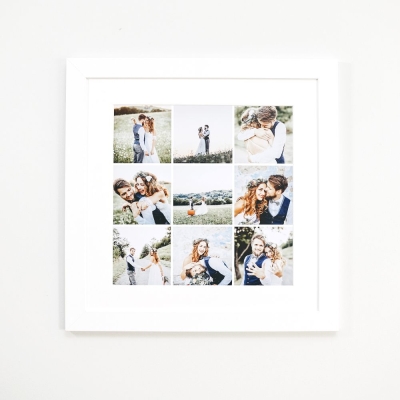 Your wedding photos can be made ultimately personalised with wedding photo collages. If you want to display multiple wedding photos in one frame take a look at the moments frame that holds 52 of your favourite pictures. The moments frame is professionally mounted into a white frame, milled from FSC approved solid wood with individual apertures. It definitely has that wow factor!