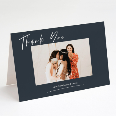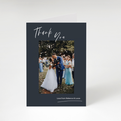 Extend the magic of your big day – and tell your tribe how much their presence and presents meant to you – with personalised wedding thank you cards. These illustrated and photo wedding thank you cards complete the Inkifi wedding stationery range. And they’re a beautiful way to show your affection and gratitude to the friends and family who helped to make your wedding day so special.Want cards that reflect the theme of your wedding? Traditional or modern wedding thank you cards? Space to showcase your favourite wedding photograph? The option to add a thoughtful hand-written note for each of your guests? Whatever type of wedding thank you card you’re looking for, you’re sure to find it here. Simply choose a style you like. Customise the design and add a personalised message if you wish. Then send a heartfelt wedding thank you note to your nearest and dearest.